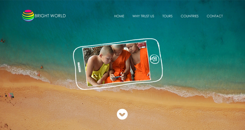 Website design for travel company with the organization of individual tours Bright World. The basis of the idea was based on the concept of creating the experience of positive emotions through interaction with a product , the embodiment of bright modern concise design style, using color and architectural shape, as well as the ease of use of the website by the client.
