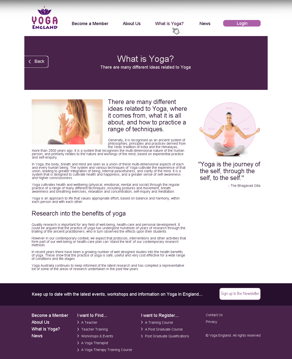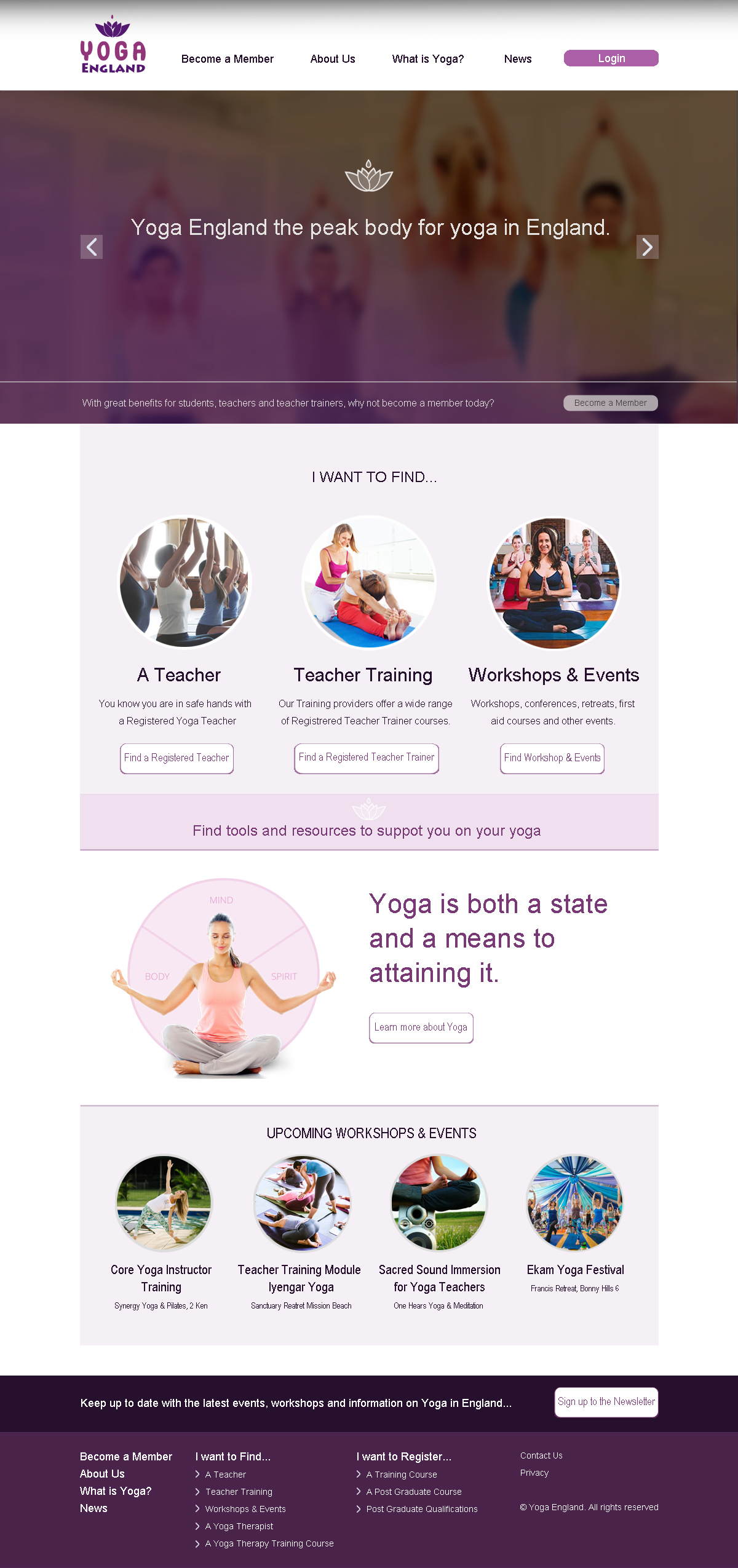 Web-дизайн корпоративного сайта компании Yoga England. Дизайн сайта йога-инструкторов со всей Англии, с содержанием групповых и индивидуальных занятий, обучающих курсов, развивающих семинаров для упрощения выбора потенциальным клиентом оптимального тренера по имеющимся критериям. В основу цветового решения выбрана пурпурная цветовая гамма, олицетворяющая цвет физического и психического исцеления, что является характерной чертой в пути исследования йогa-практики как науки в целом.