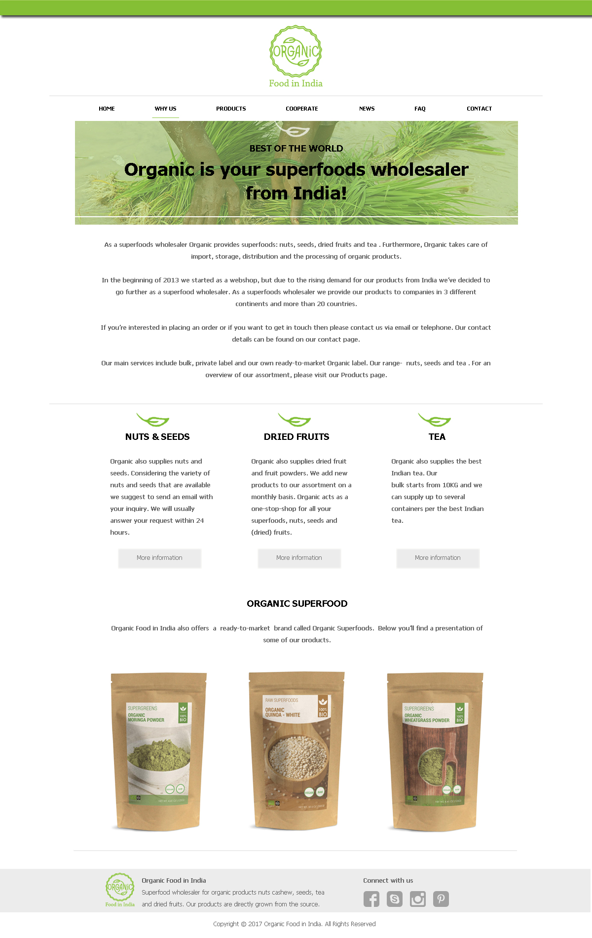 Web- дизайн для компании Organic, Food in India. Дизайн сайта компании-поставщика органических продуктов из Индии по всему миру выполнен в природных оттенках с преобладанием зеленого, с использованием сочных изображений природы и народа этой страны.